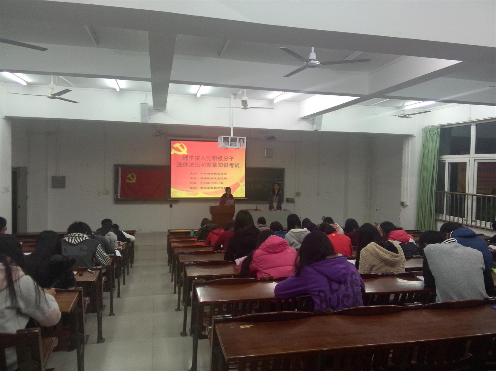 为了弘扬依法治国精神和增强入党积极分子的法律法治意识, 2014年12月13日晚,理学院组织2014级新生中的入党申请人员参加了《入党积极分子法律法治和党章知识》考试。本次考试受到了入党申请人员的热烈欢迎,大家踊跃报名,共174人参加。