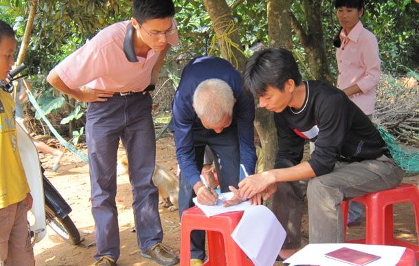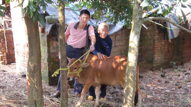 与村干部将用于购买小公牛的扶贫基金交到扶贫户手中