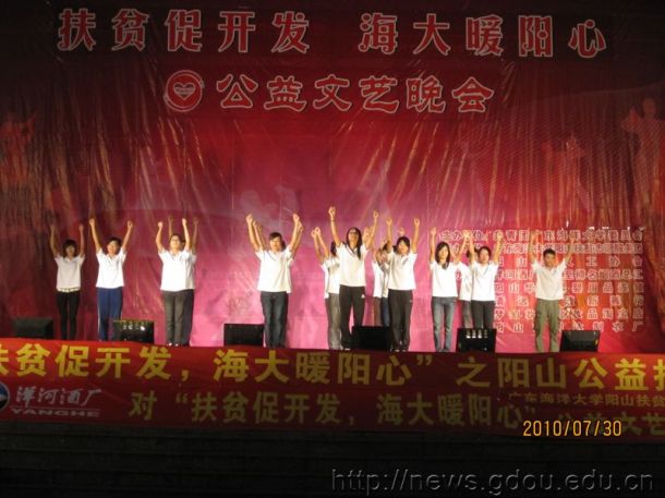 7月30日晚,服务队在阳山影剧院广场举行了以“扶贫促开发,海大暖阳心”为主题的公益文艺晚会。队员们表演了小品、舞蹈、歌曲串烧等精彩节目,赢得了在场观众阵阵的掌声。晚会引起了更多的人对山区贫困人民的关注,呼吁更多人投身到扶贫济困活动中,把爱心献给贫困山区的人们。