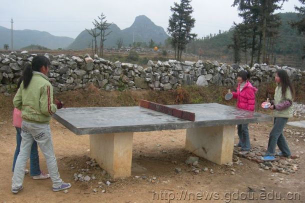 比起旁边破损的篮球场,女同学能有一张完好的水泥砌成的乒乓球台,她们已经很满足了